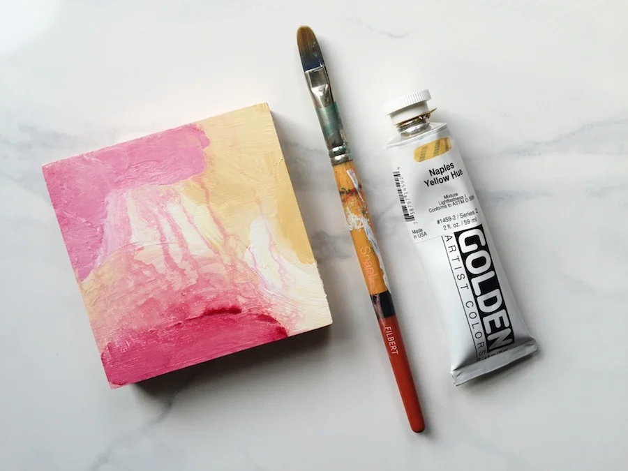 I didn’t do my usual routine of playing music, smudging and lighting candles, I simply poured out a little paint and worked on a tiny, 4-inch wooden block that I had primed with titanium white paint last week. I didn't even clean my palette from the last time I painted, shocking! I thought working so small would be an interesting re-entry to painting for me since I normally paint on 30” square canvases. Although I have no clear sense yet about composing a painting that small, it was much less pressure to approach this tiny square than the big ones in progress on the wall. I chose the same color palette as my newest work in progress: titanium white, naples yellow hue, quinacridone red and cadmium yellow deep hue. This palette is inspired completely by a photo I took in September of a cafe au lait dahlia during the golden hour, while photographing my desert botanical card collection for my wholesale program and online shop.