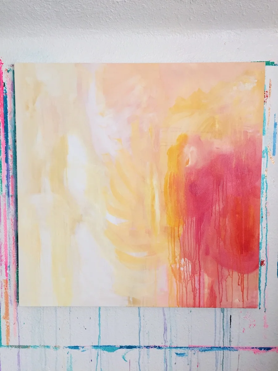When I look at that photo and paint in those colors, I am transported to the warmth of the sun pouring into my living room that day, the way the large blossom captured my attention such that it was hard to concentrate on my greeting cards, how the sun bounced off my amber striped sahaj curtains from World Market which draped onto the antique brown hardwood floors by my mustard yellow sling chair. I’ve been craving these yellow tones for many months now and incorporating them into my home, and now it is spilling over into my palette and onto my canvas, like slowly melted butter on the stove.